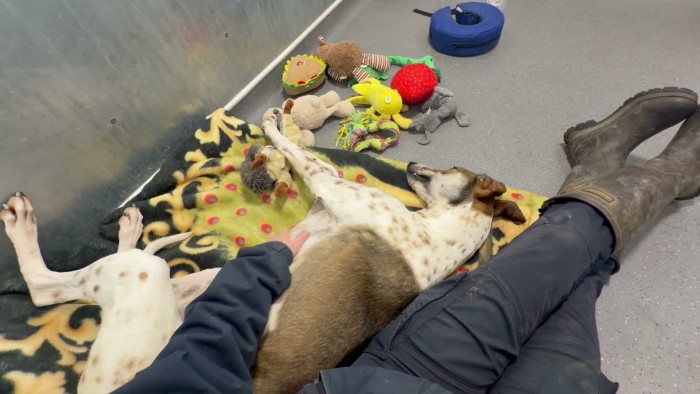 A member of the animal care team will take the dog out for a walk with you.