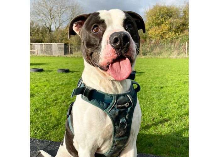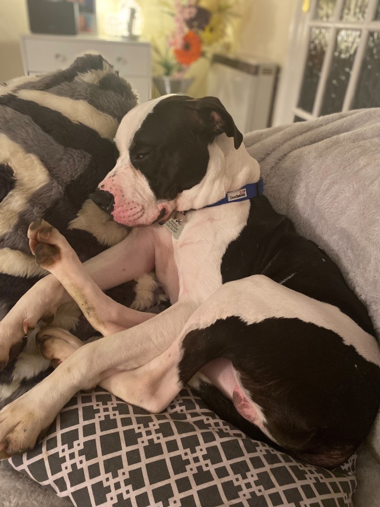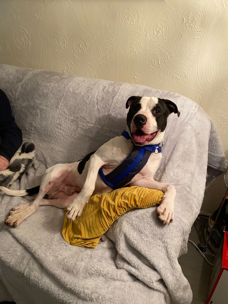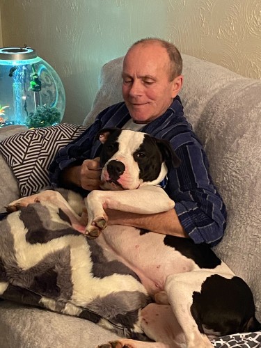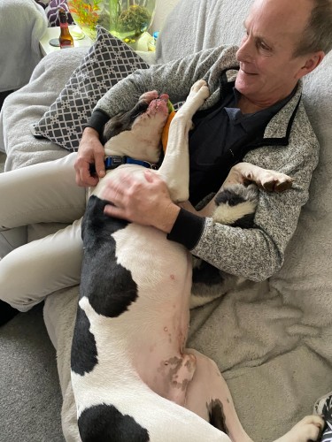 "Rodney has settled in very well, eating well, sleeping in his bed at night, and getting plenty of walks. He is so such a character, very loving dog cuddles up with head on my lap and sleeps although he thinks he is a lap dog sometimes. No trouble putting harness on he sits and waits, has calmed down considerably to what he was like to start with and has got into a routine already - tell him bed time and he gets in his basket at night. Friendly with the rabbit they touch noses through run, still training him not to pull so much on the lead, he has although got a lot better, we have to watch what we leave in kitchen as he nearly managed to eat my frying pan! We are so glad we got him!"
