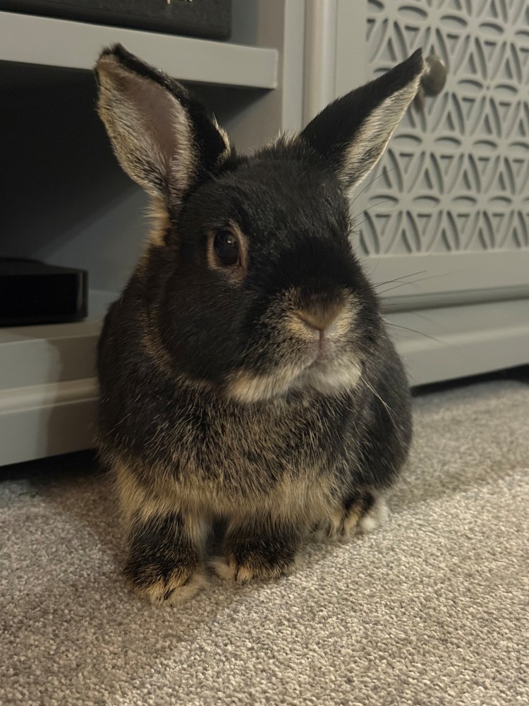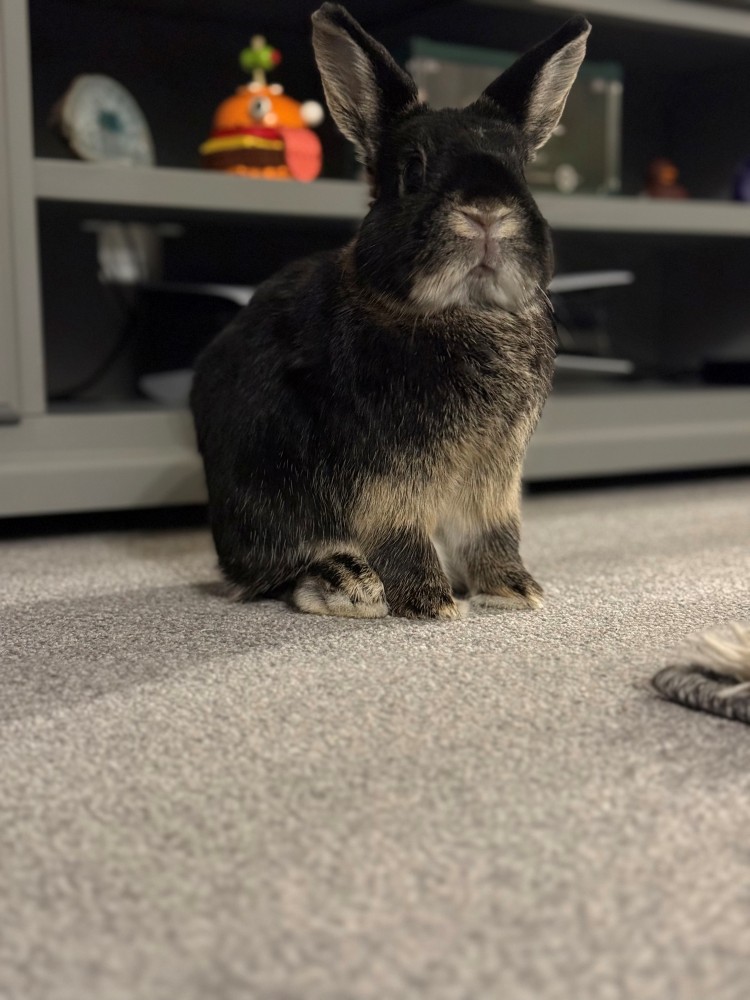 "We adopted Maple (formerly Midnight) from Danaher in November 2022, hoping to bond her with our single dwarf Ash. We all instantly fell in love with Maple and we had them bonded within a month. A little over 3 years later and their bond is stronger than ever. She is the sweetest little girl who has a lot of love to give to both her furry and human family, although she can get up to some mischief when she thinks no one is looking! After zooming around the flat she loves nothing more than snuggling on her blanket."