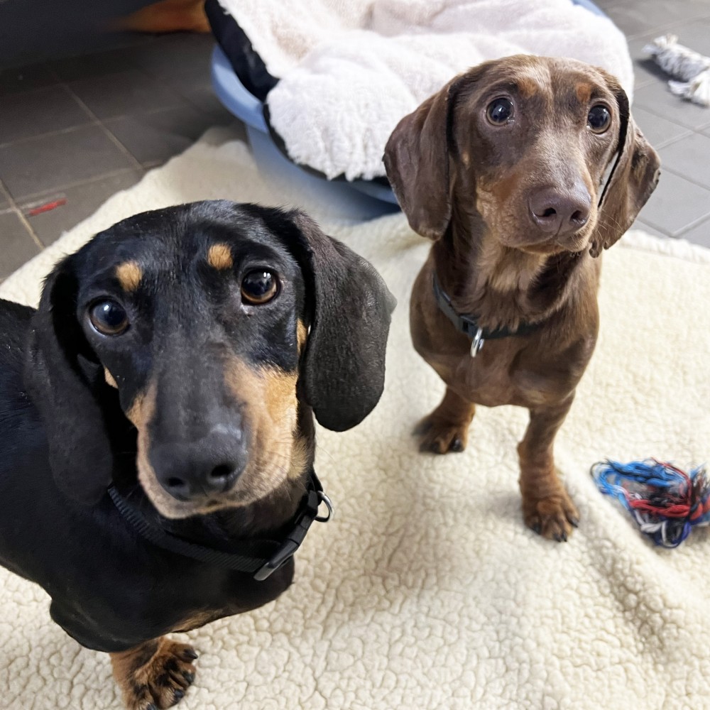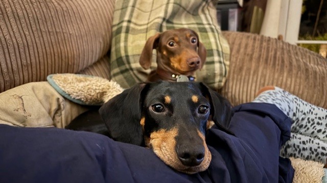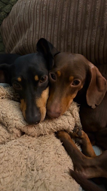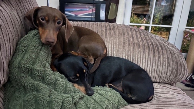 "When we first bought the girls home we weren’t able to catch them if they were off the lead, they didn’t know their names and they were timid and anxious about everything and everyone. The first few months were hard work as they couldn’t be left. There was a time I wasn’t sure I could cope with them. But they are so lovely and really really deserve a second chance at life. I’ve had dachshunds for more than 20 years and had a family of four which I bred previously. So I know the breed well. They can be stubborn. The girls weren’t house trained when they arrived, barked at everyone. Now, they are such good girls and have grown in confidence and continue to do so all the time. They absolutely have been worth persevering with. They love ‘their people’ and once they get to know new people they love them too. I can remember the first time they came up on the sofa voluntarily. They now snuggle with me on the sofa in the evenings and can’t get close enough, I have hardly sat down and they are on my lap. They are incredibly affectionate. They love my parents Labrador who lets them snuggle in bed with him. They also love to play chase with him in the garden. I don’t think they got the memo that they are Dachshunds not Whippets. They love spending the day in front of my parents Aga on the odd days when I have to go to the office for work. They love to play and wrestle and chase each other. They love walks in my village and walk well on the lead now and don’t seem to mind any weather as long as they can come home to their nice bed for a warm up and dry off. They are good a being left for short periods as long as they have each other and the radio on and a tasty chew. Wilma LOVES her toys, my neighbour donated them a whole toy box of unwanted toys from their dogs and she loves playing with them and has some particular favourites and seems to be such a baby. We were told they are sisters but I am convinced Wilma is Betsy’s daughter. Betsy appears a bit older and more sensible. Wilma is still a bit of a worrier. And can be a bit reactive at times. I am so pleased you kept them together, they are inseparable. Wilma has grown and they have both filled out and have fabulous shiny coats."