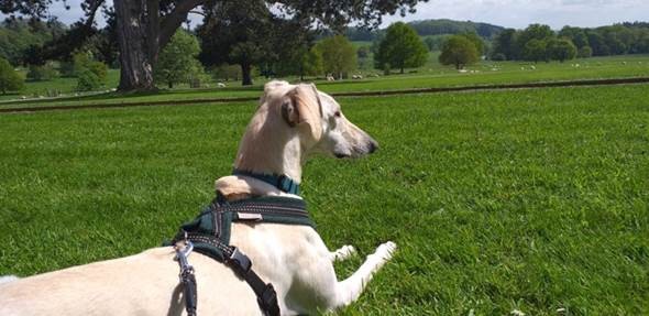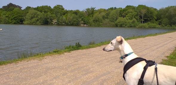 He loves to run free when we rent a local secure field from a farmer, but also walks along nicely when on his lead.