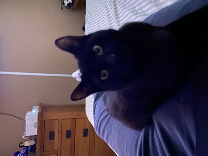 When she’s home alone she cry’s a lot and in the summer spends most of her time out playing in the garden. A cunning little hunter at heart always bring us presents home but we love her to bits and are so glad we changed our mind of not wanting a black cat.
